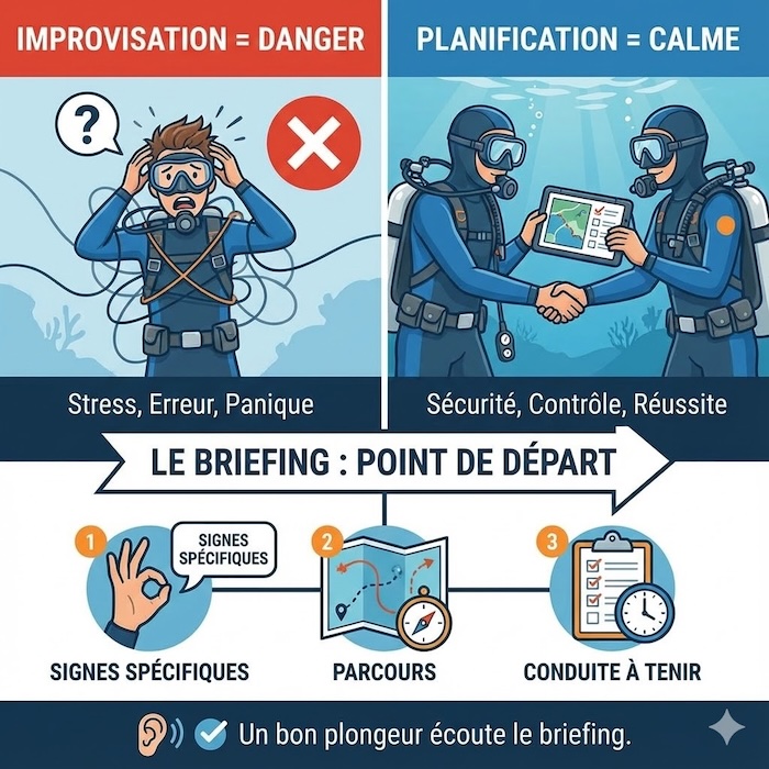 C'est le "contrat" de la plongée. Écoutez les consignes du directeur de plongée avant de partir.